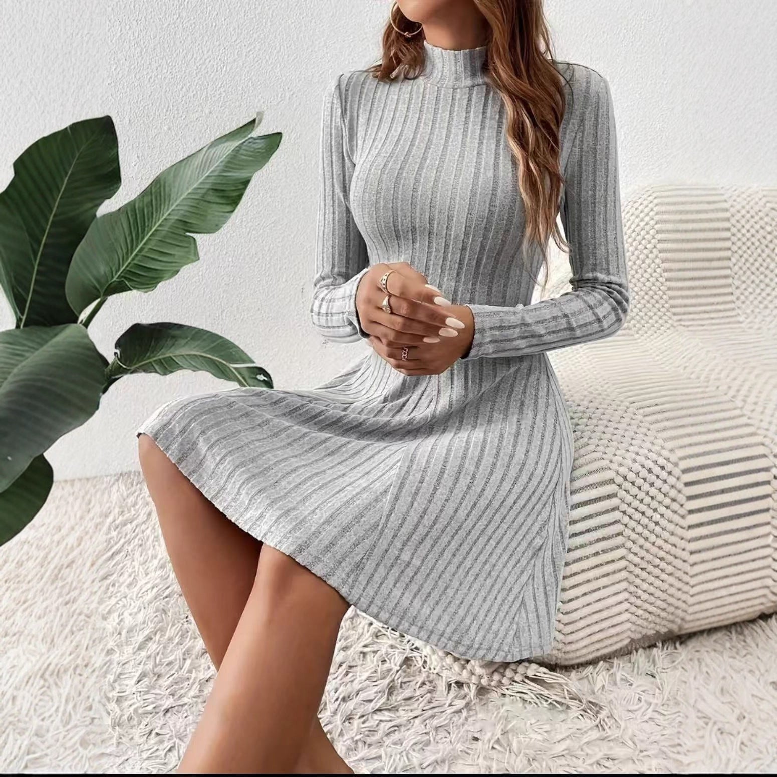 Elena™ Slim Fit Ribbed A-Line Dress – High Neck & Long Sleeves